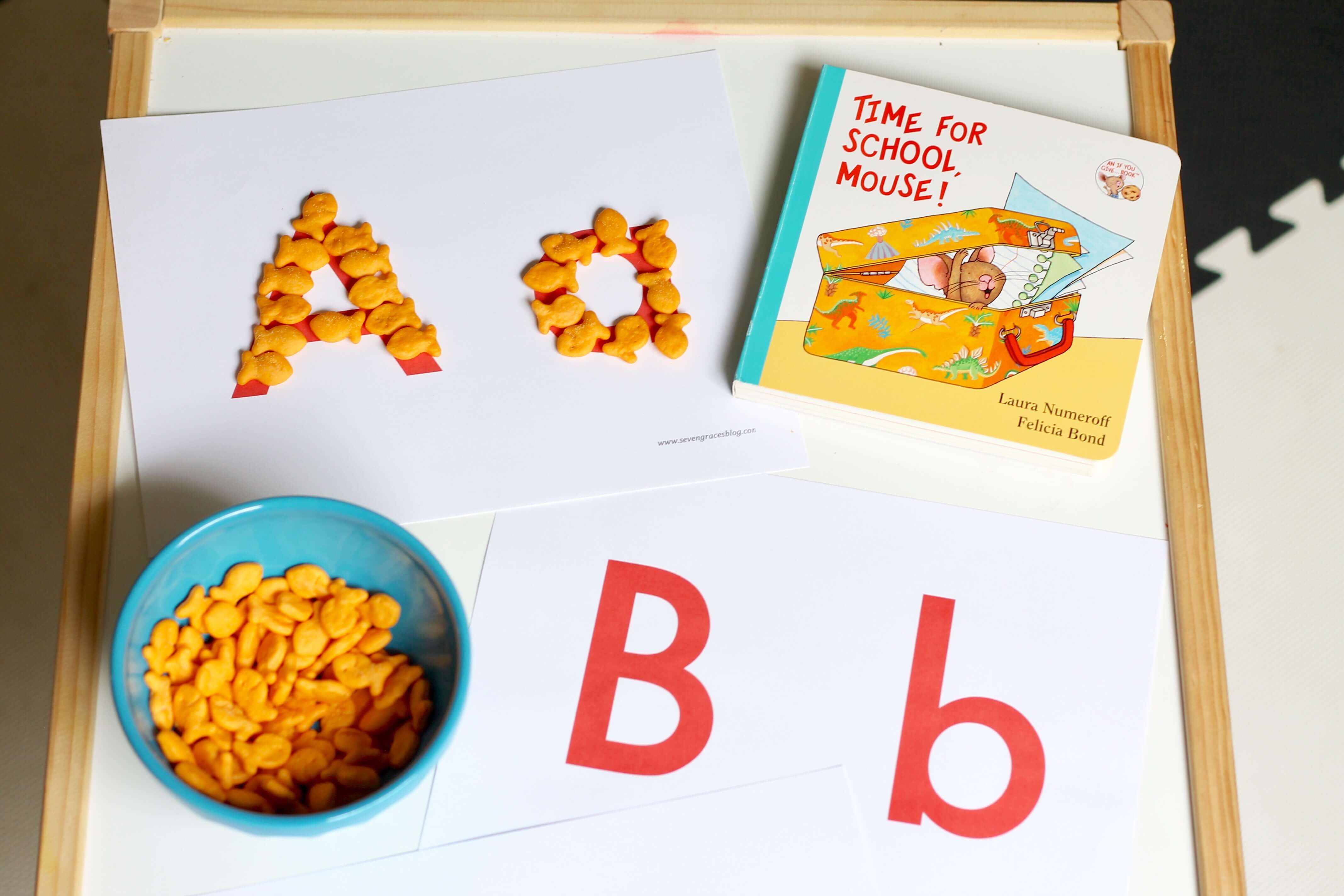 By using Goldfish crackers to trace the upper and lower-case letters, it allows her to see and create the shape of each letter with a manipulative, upping her chances to work the recognition into her long-term memory. She tells me what letter she’s working on as we spend time together, and after she’s done with a few, she eats the Goldfish as her afternoon snack. It’s the perfect snack hack: learning while eating! She could have fun with this for hours if I let her, but it’s all up to you and your schedule.