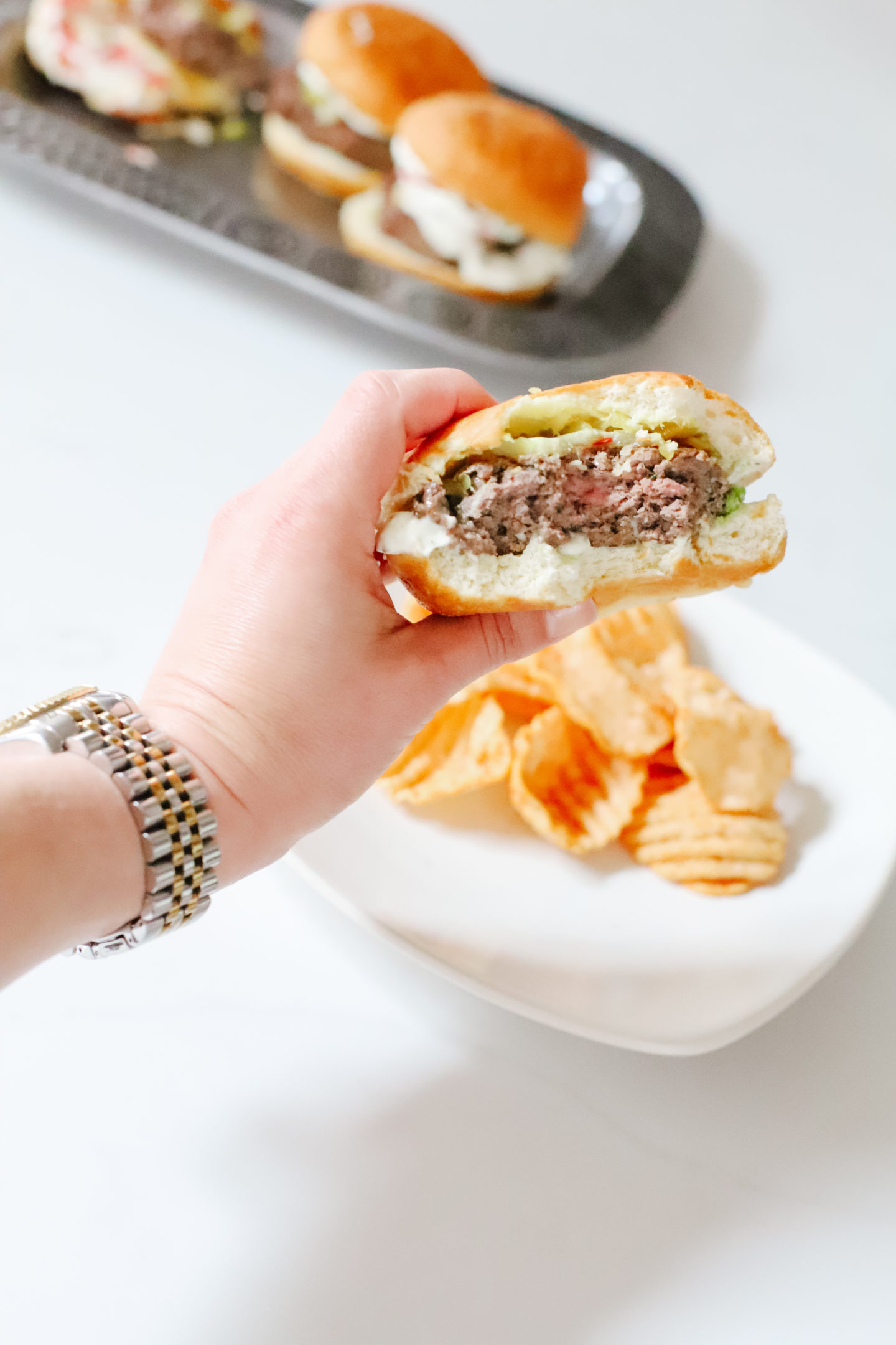Add any other burger trimmings you’d like! We kept it simple with dill relish and tomato slices. Time to make your slider and enjoy! Serve with your favorite chips!